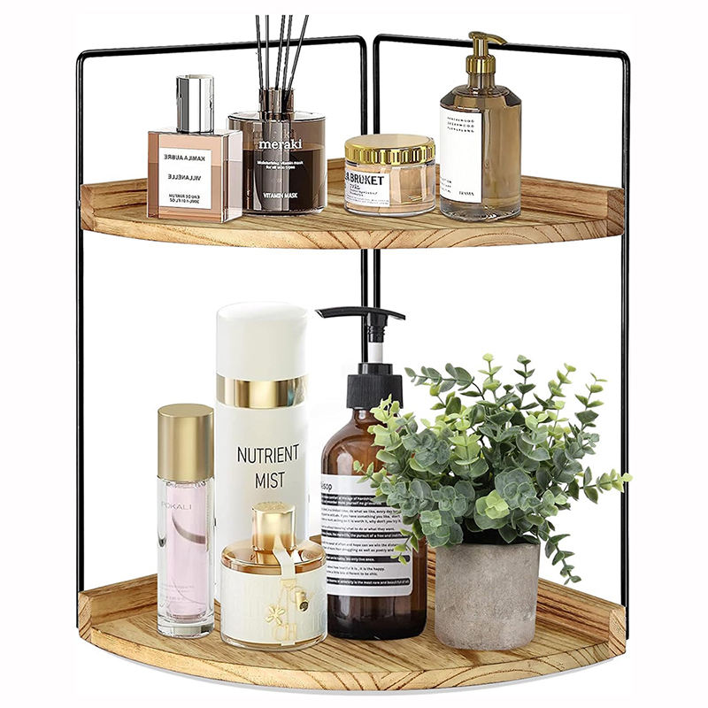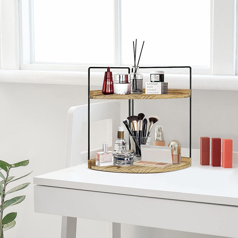 Scaffale di stoccaggio del bancone del bagno a due strati, scaffale d'angolo in legno per il piano di lavoro della cucina, portaspezie, scaffale di stoccaggio del Desktop
