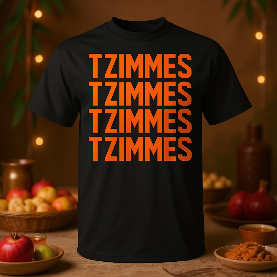 T-shirt Tzimmes Nero con Testo Arancione Tema Cibo Vegano Ebraico Rosh Hashanah Unisex Adulto Manica Corta Girocollo Stampa Serigrafica