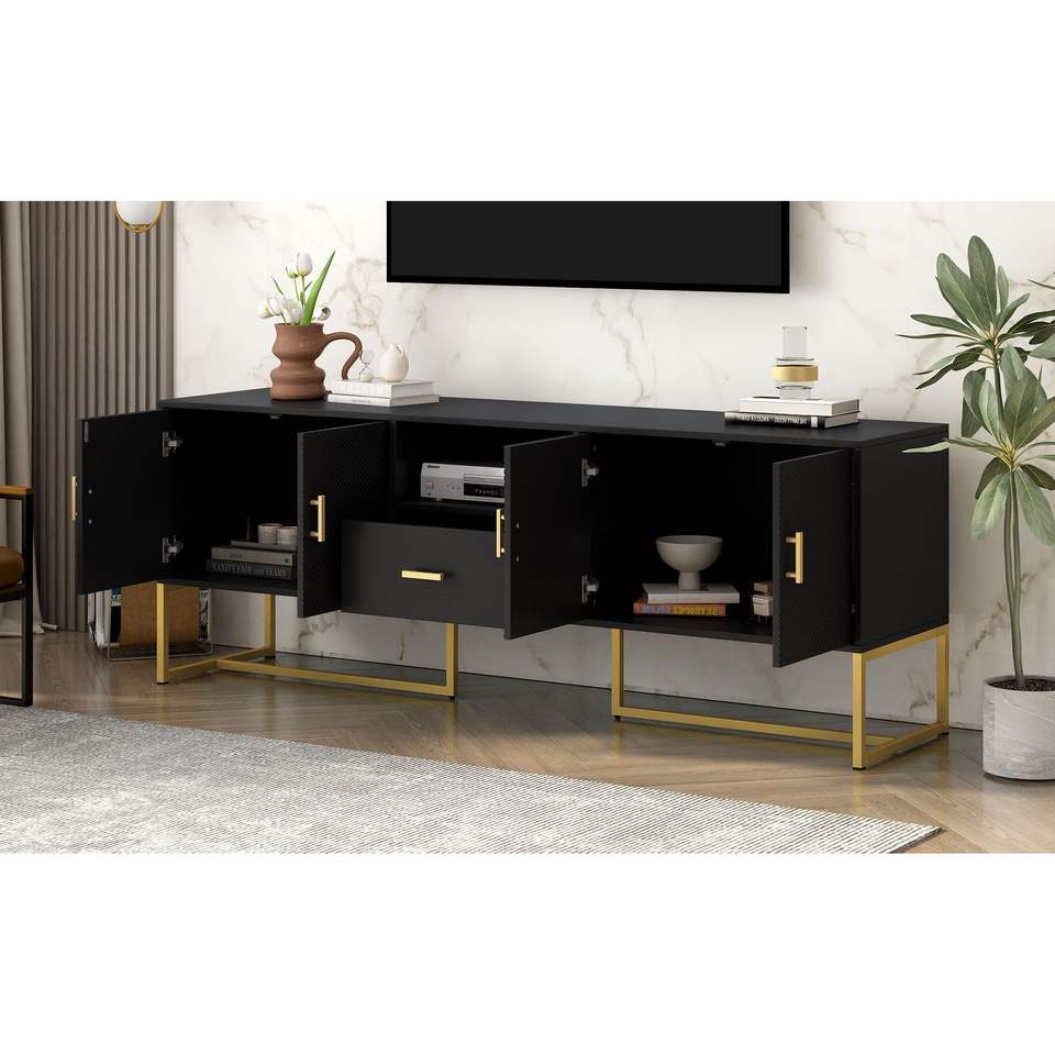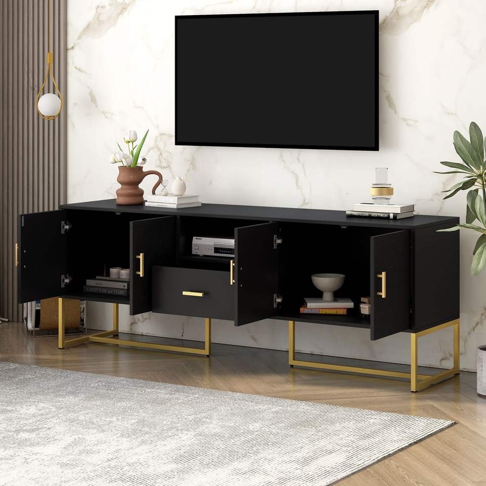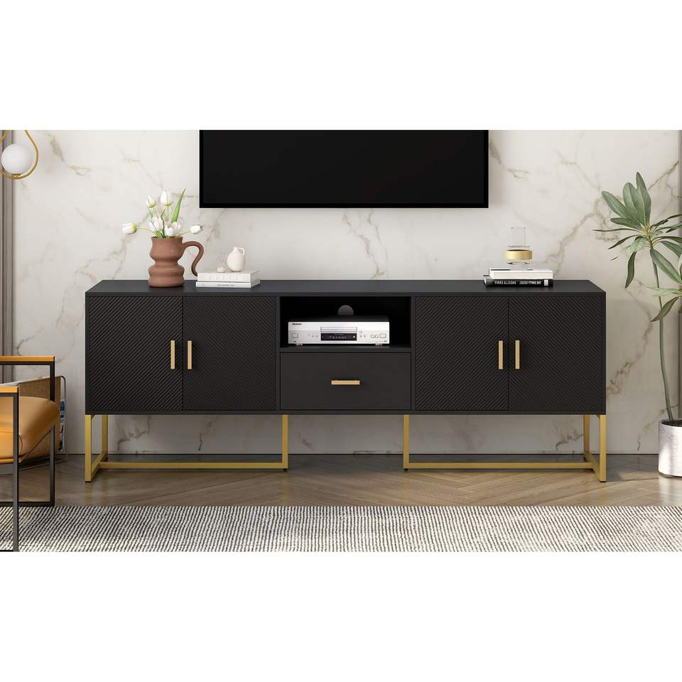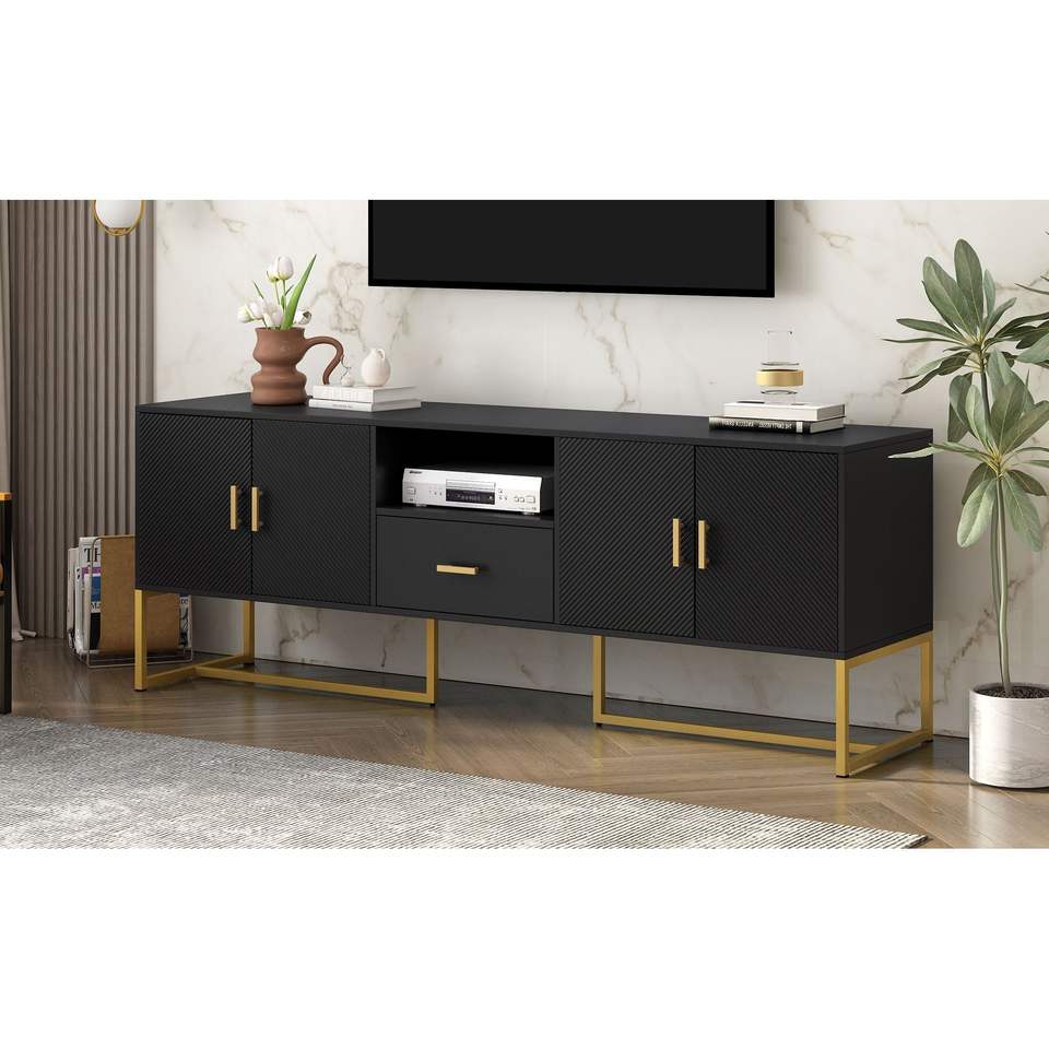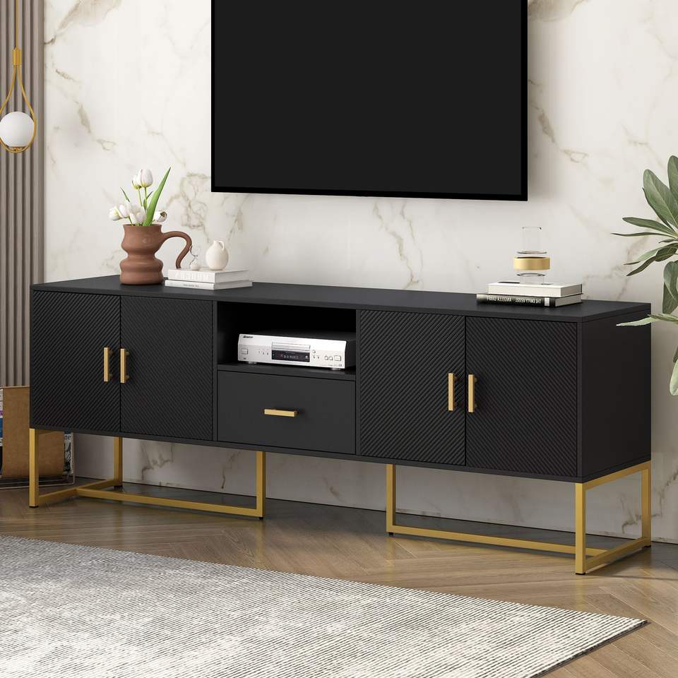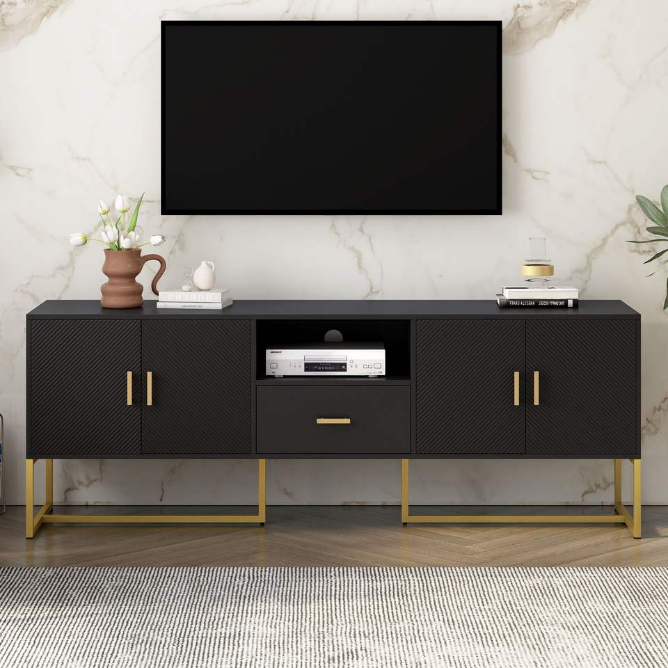U-Can Modern TV Stand for TVs up to 70 Inches 1 Drawer with Anti-tip Device 2 Cabinets Metal Legs Elegant Living Room Furniture
