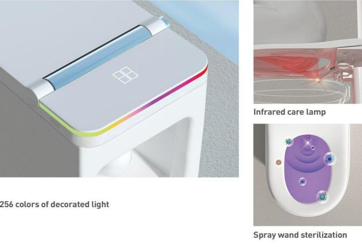 Controllo vocale, Scudo in schiuma, Terapia a infrarossi, Sterilizzazione UV, Copertura automatica dell'interruttore, Tocco del piede per aprire il coperchio, 256 colori di luce decorata, Tocco del piede apre il sedile, Risciacquo con tocco del piede, Luce decorativa singola