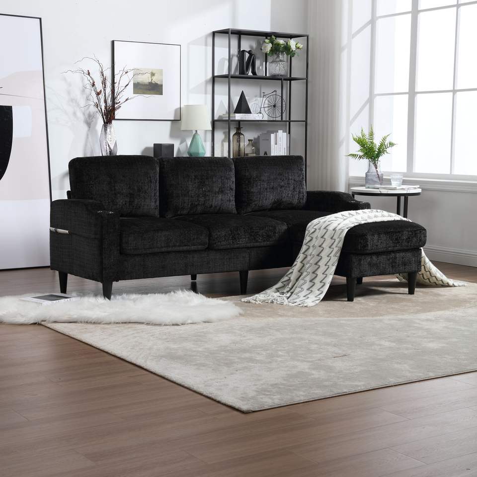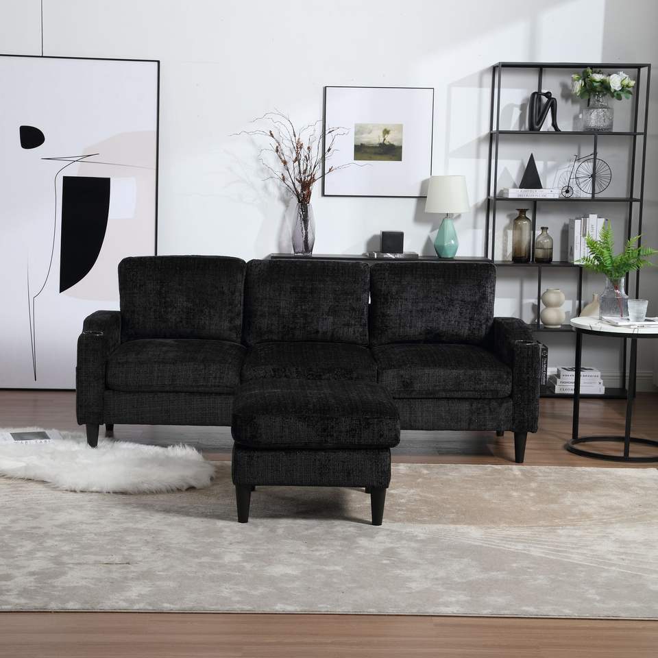 UNITED WE WIN Divano a Tre Posti con Struttura in Legno Massello e Tessuto Chenille, Tasca Laterale, Due Portabicchieri e Poggiapiedi con Vano Portaoggetti