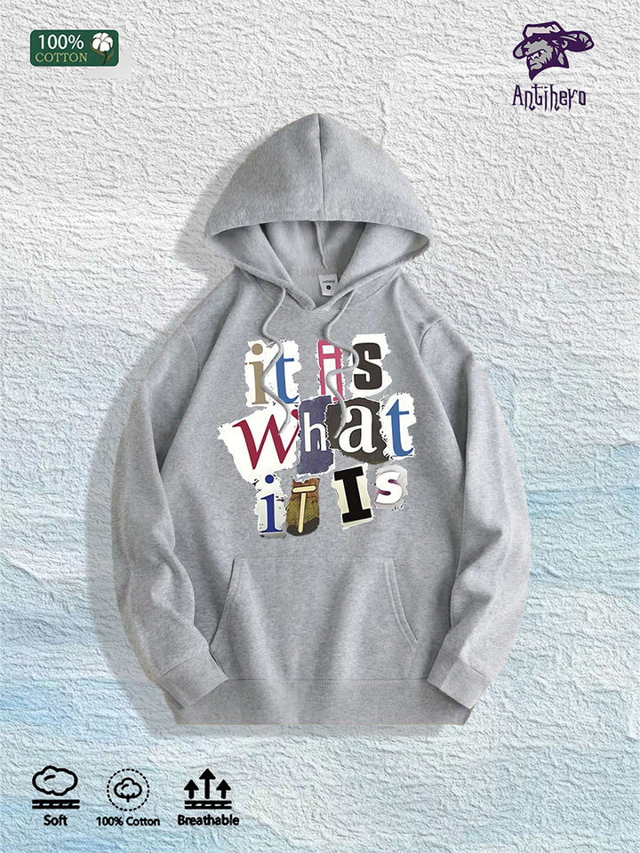 Magazzino Locale USA: Felpa con Cappuccio 100% Cotone con Grafica Collage 'It Is What It Is', 7 Colori