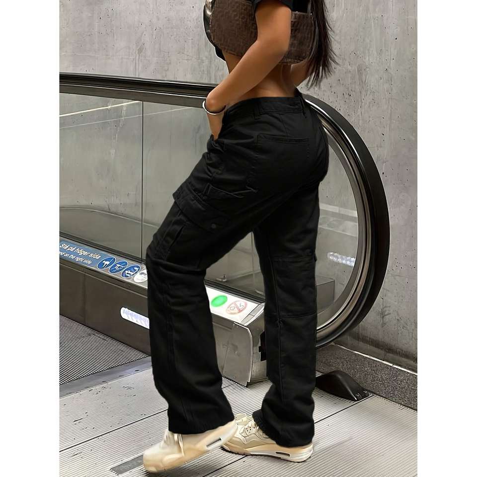Spedizione Gratuita negli USA, Pantaloni Cargo da Donna Stile High Street, Gamba Larga e Dritta, Multi-Tasca, in Denim, Vita Alta, Casual