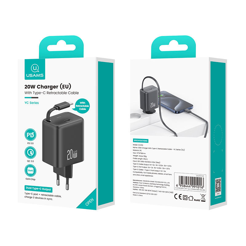 USAMS CC233 miglior prodotto di tendenza 2024 personalizzato portatile 20W telefono ricarica rapida geu US UK Plug adattatore per telefono