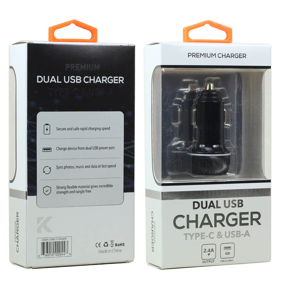Adattatore per caricabatterie da auto USB-A e USB-C (TypeC) 2A a doppia porta, ricarica rapida universale per tutti i modelli di telefono, nero