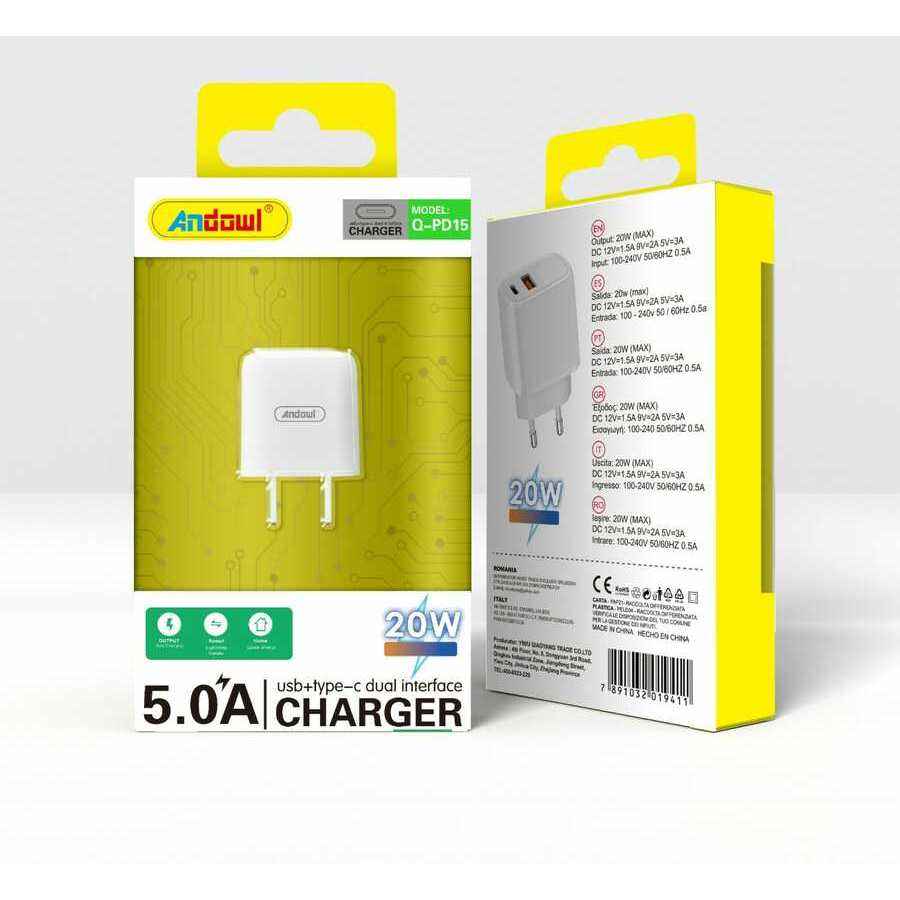 Andowl Caricatore USB Type C da 20W con Doppia Porta QC2.0, Adattatore da Tavolo per Ricarica Rapida di Telefoni e Tablet