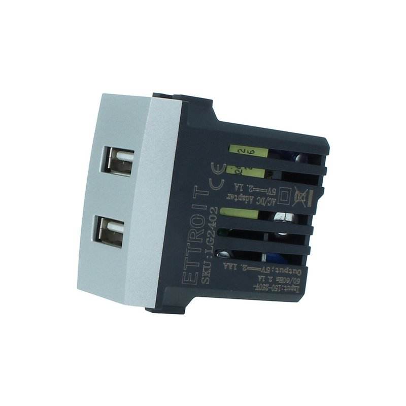 Modulo Presa di Ricarica USB 5V 2.1A con 2 Porte USB-A, Colore Grigio, Protezione da Cortocircuito SCP, Compatibile Bticino Living International EU