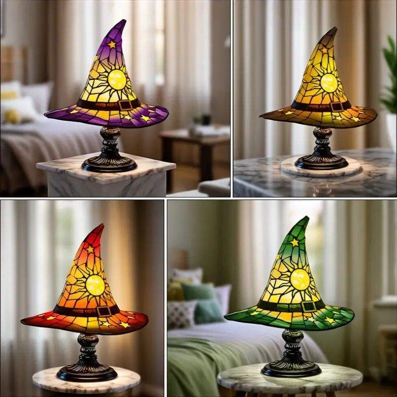 Lampada USB Gotica Retrò in Resina con Cappello da Mago, Design Creativo a S, Pannello in Vetro Colorato per Camera da Letto e Feste, Lampade a Forma di Cappello da Strega