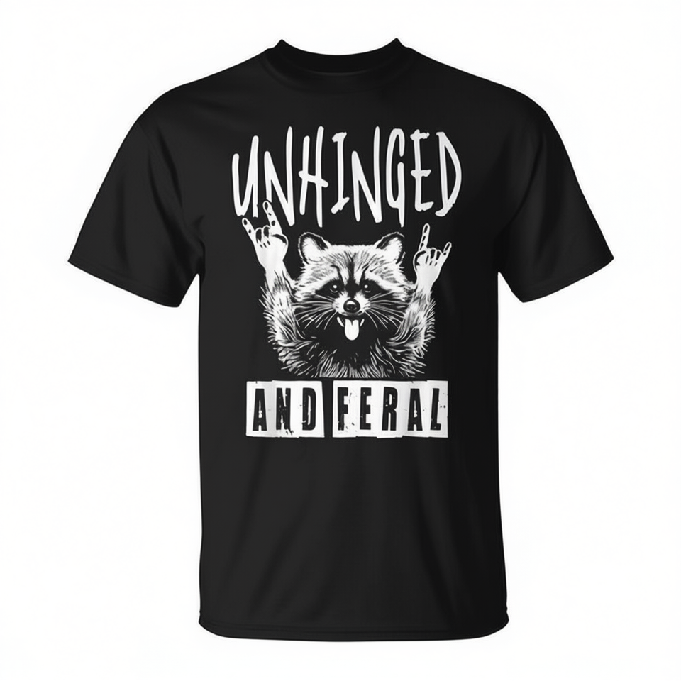 T-shirt Unhinged And Feral Raccoon dal design retrò con meme, stile streetwear nero