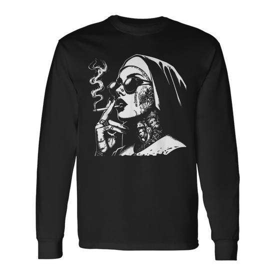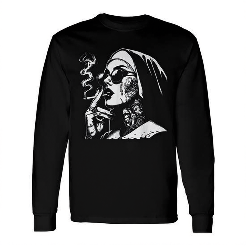 T-shirt a maniche lunghe Unholy Nun Horror, design artistico gotico nero