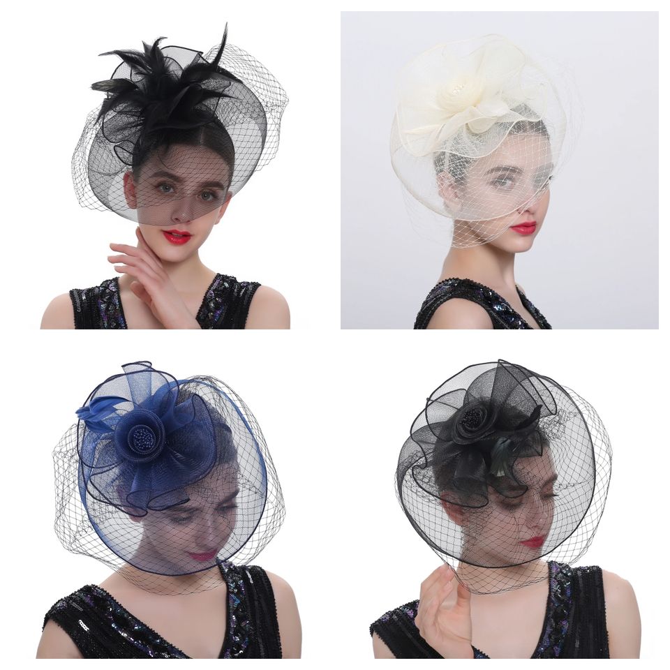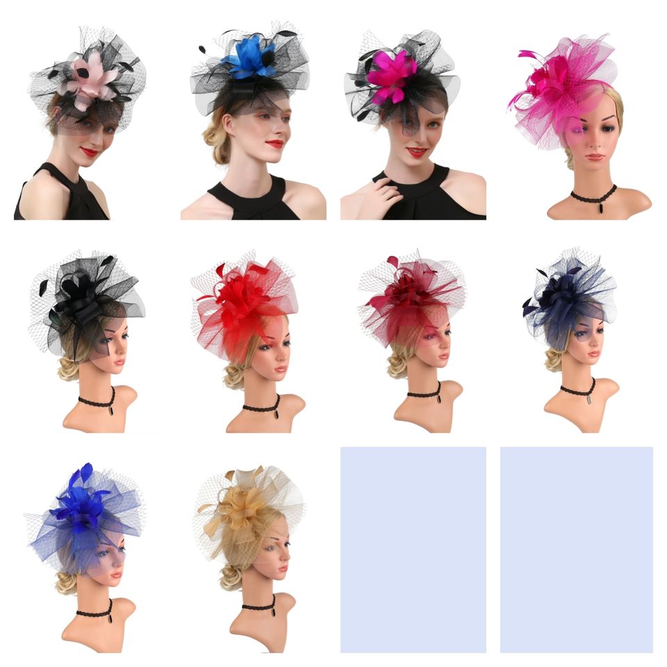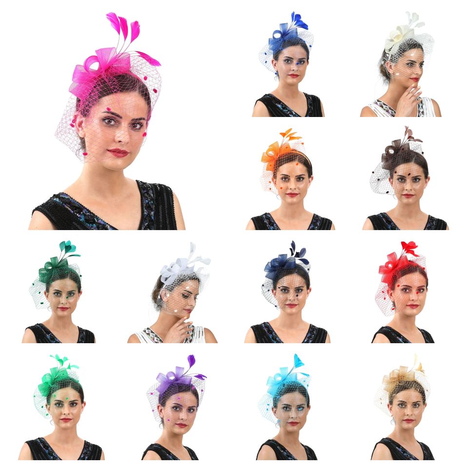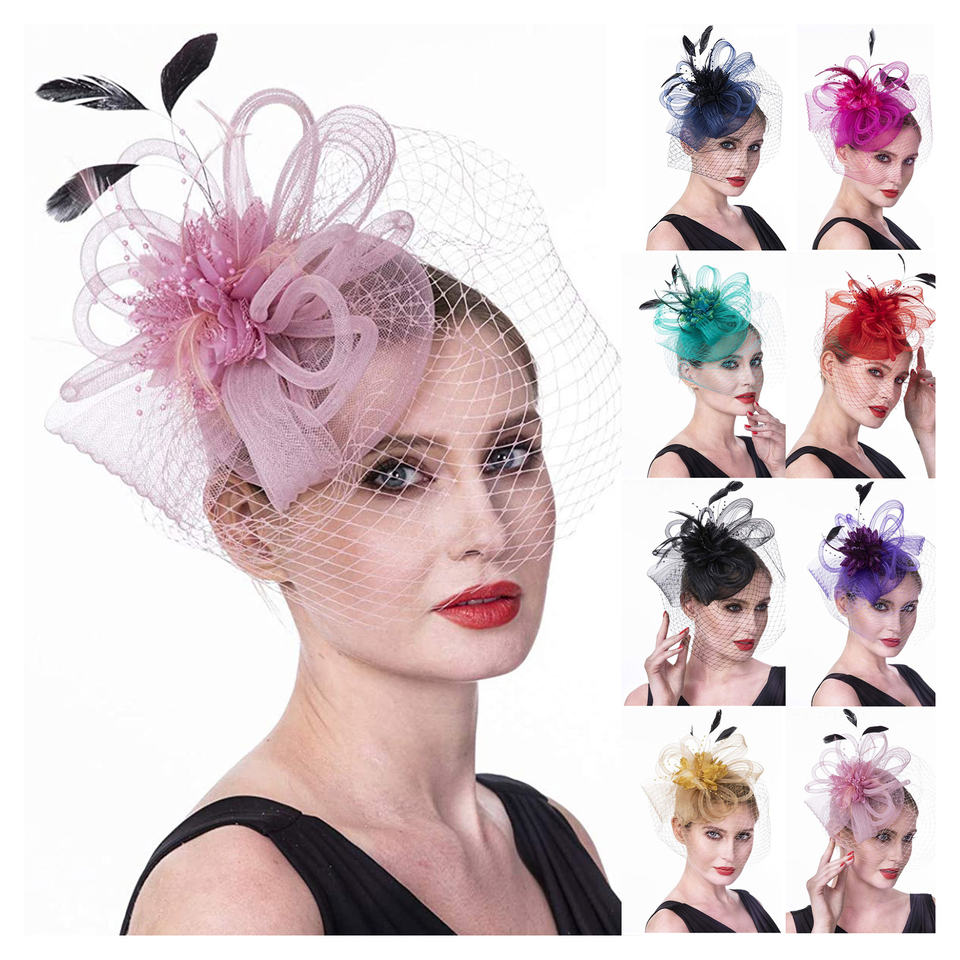 Accessori per Capelli Eleganti e Unici Fascinator in Rete Elastica Multicolore con Piume e Fiori Fascinator con Velo per Sposa