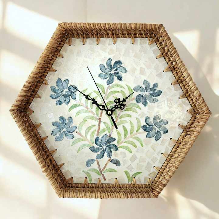 Unique time pieces rattan wall hanging analog clock high quality clocks with mosaic shell inlay