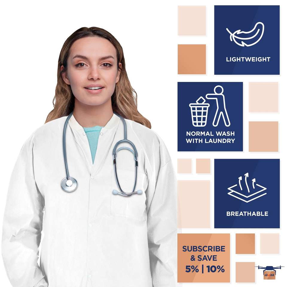 Giacca da laboratorio Unisex da 30 pollici monouso 100 Pack abbigliamento da lavoro bianco lungo fino ai fianchi camicie da 50 Gsm con bottoni a bottoni in maglia frontale con collo 3 di sicurezza