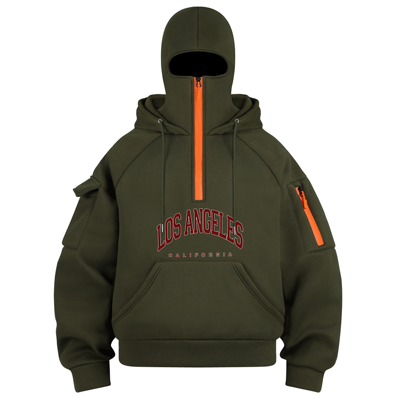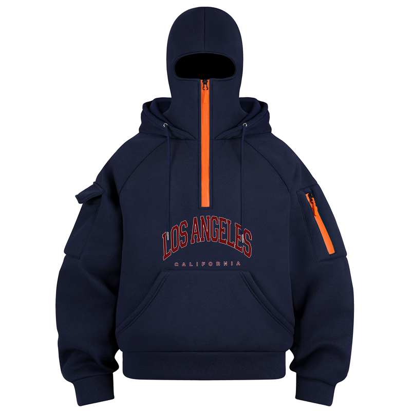 Unisex Balaclava Casual LOS ANGELES Print Knitted Hoodie Autumn Winter Fashion Cozy Pullover Long Sleeve Zipper Pockets Hooded