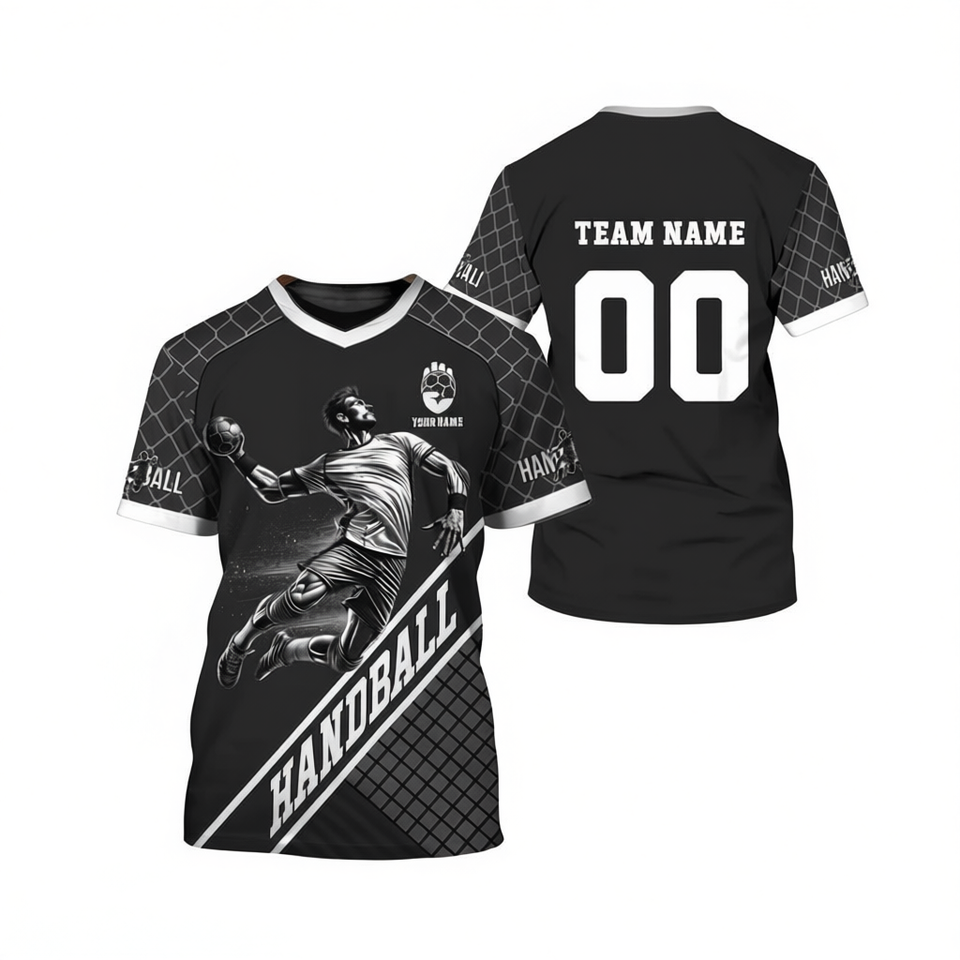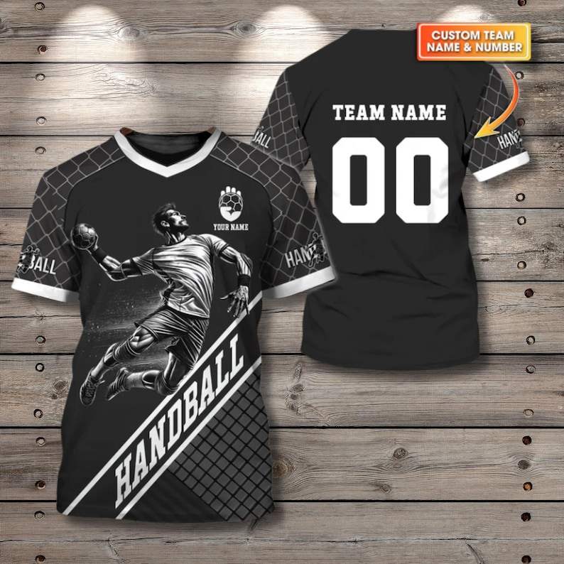 Maglia da Pallamano Personalizzata Unisex con Nome e Numero della Squadra, Nera e Grigia, Regalo Perfetto