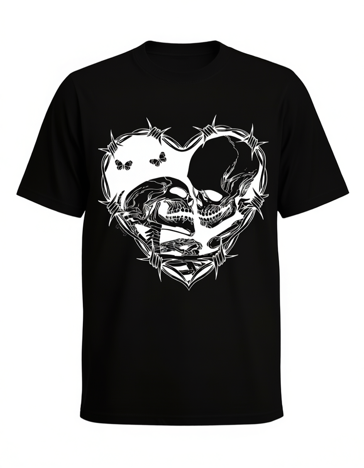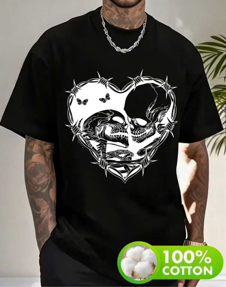 T-Shirt Unisex con Stampa Teschio e Cuore, Nero e Bianco, Stile Semplice, Manica Corta, Collo Tondo, Vestibilità Regolare, 100% Cotone, Lavabile in Lavatrice