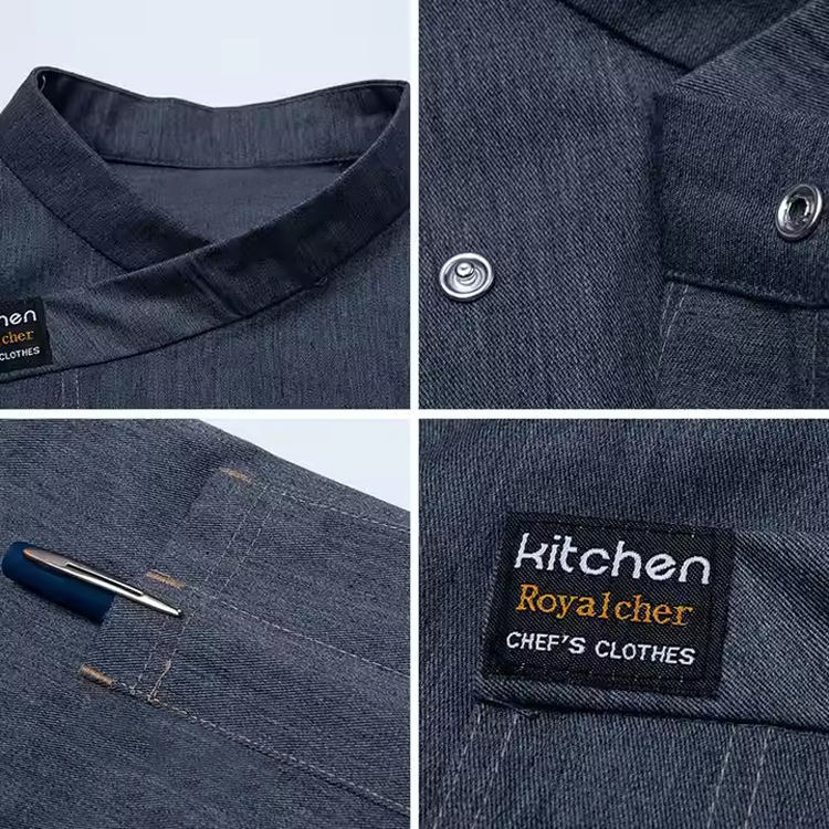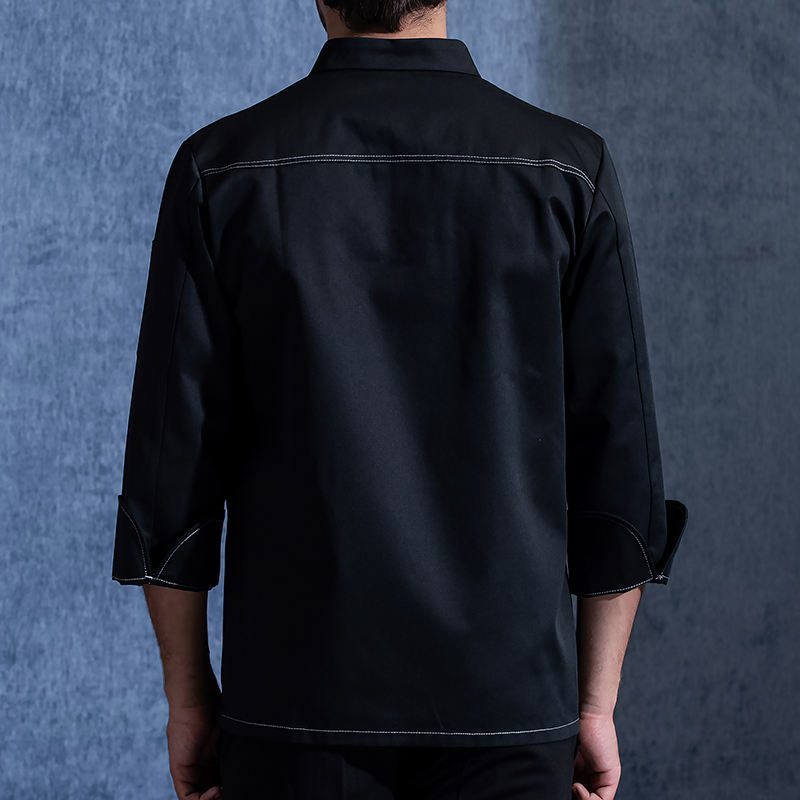 Uniformi da ristorante e Bar di alto livello Unisex giacca leggera da Chef nera con Logo personalizzato in tessuto in sgualda per hotel