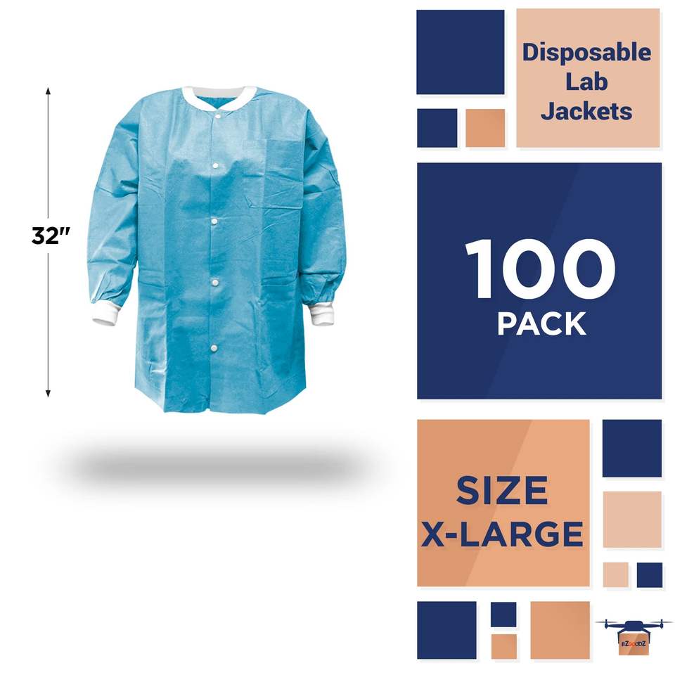 Unisex X-Large PPE Coat 32-Inch Disposable Hip-Length Workwear 50 Gsm SMS 3 Pockets Snaps Front Knit Cuffs Medical Blue Pack Lab