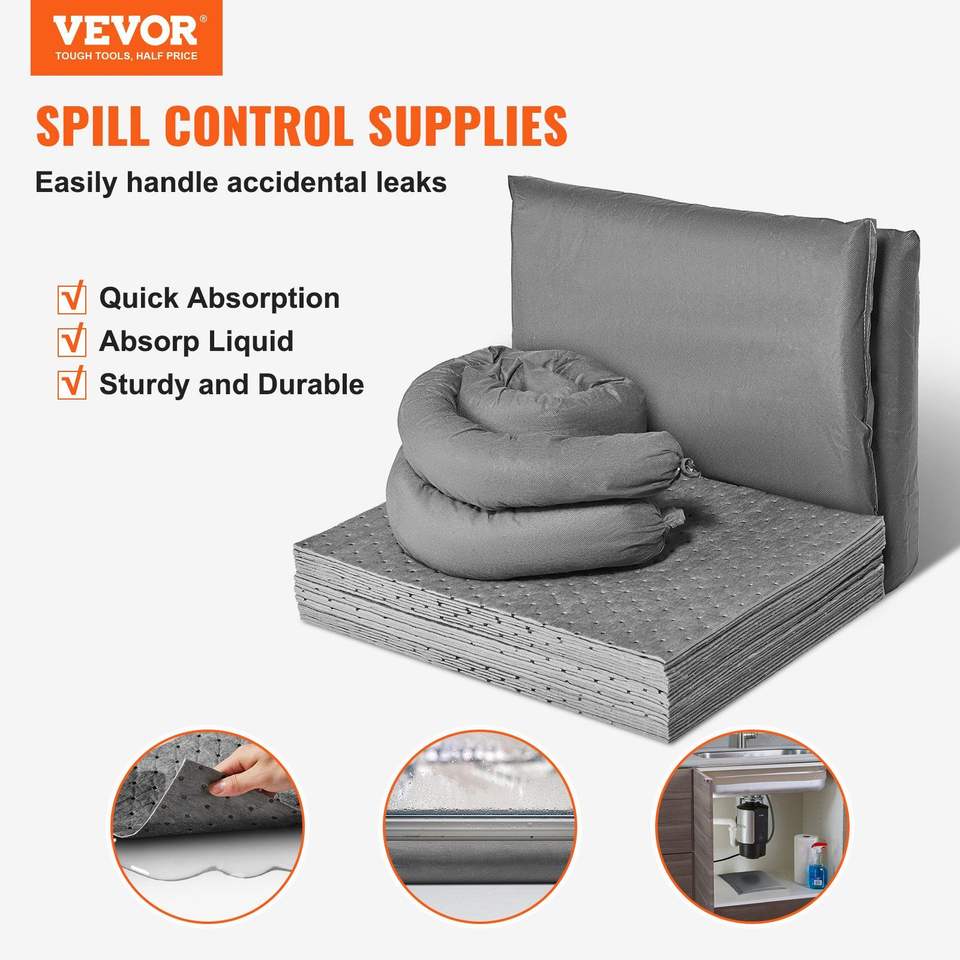 Kit Universale Anti-Sversamento da 43 Pezzi, Include 30 Tamponi Assorbenti e 2 Calze Assorbenti 3"x4" Disp