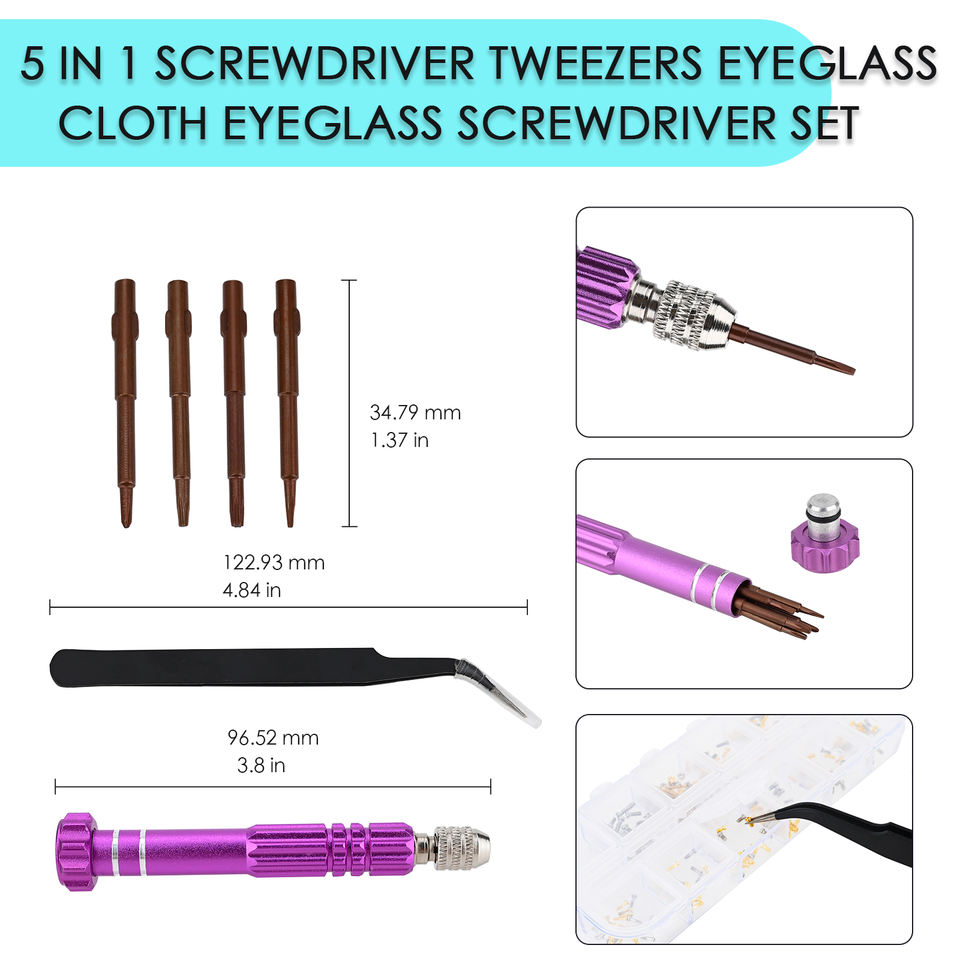 Kit di Riparazione Occhiali Aggiornato, Contiene Cacciavite Magnetico 5-in-1, Supporto Nasale per Occhiali, Supporti per Orecchie, Pinzette