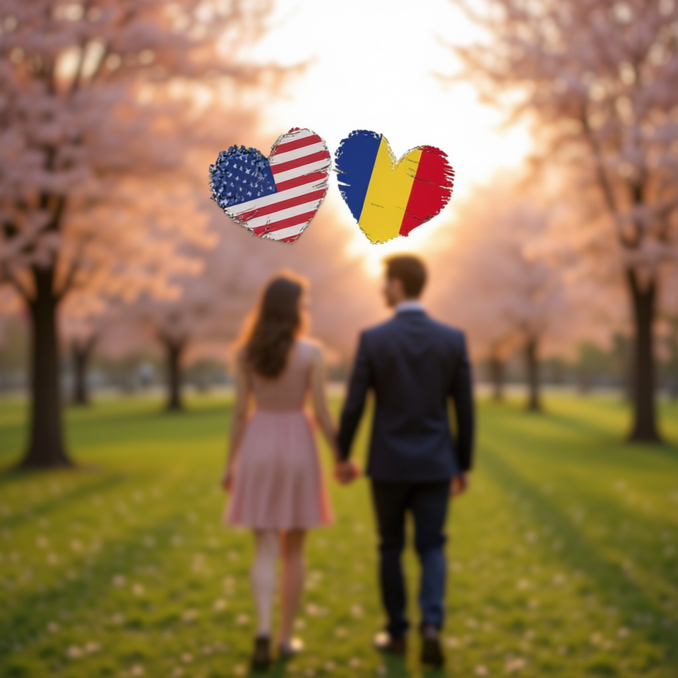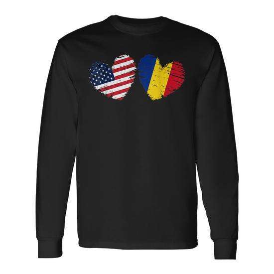 T-shirt a maniche lunghe con bandiera a cuore USA-Romania, San Valentino, rumeno-americano