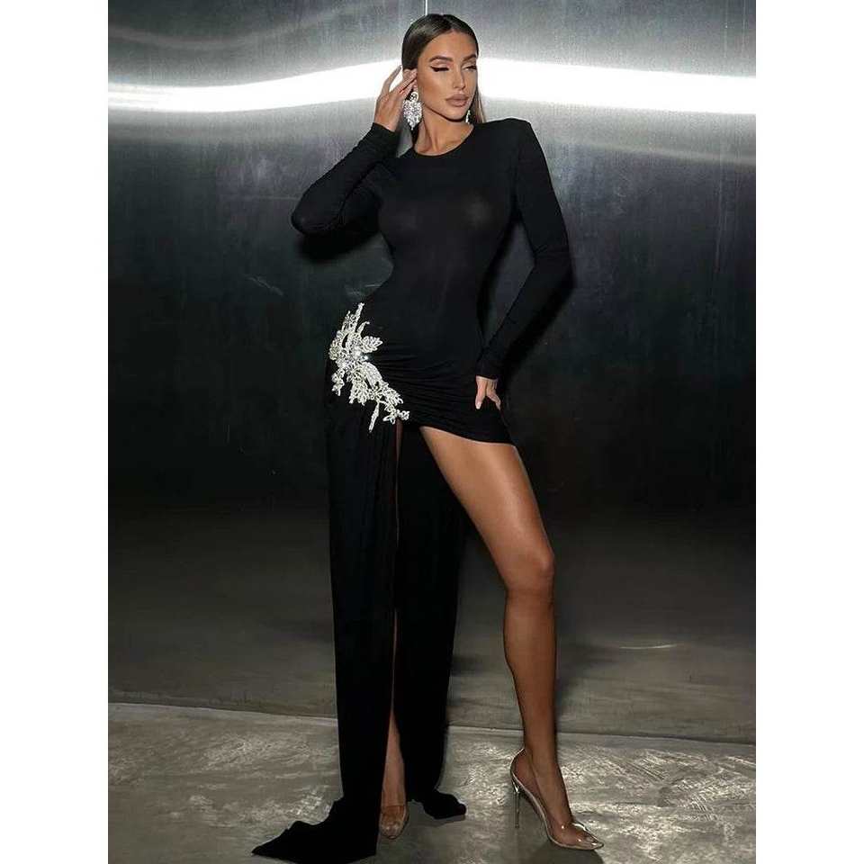VC Women's Floral Bodycon Dress O-Neck Long Sleeves with High Waist Bead Appliques Black Patchwork for Cocktail Party Wear