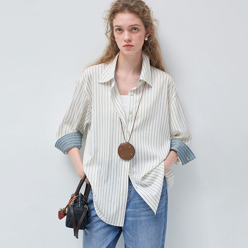 VEGA CHANG Camicia Primaverile da Donna a Righe Verticali con Spalle Scivolate, Blusa Casual Classica Bicolore