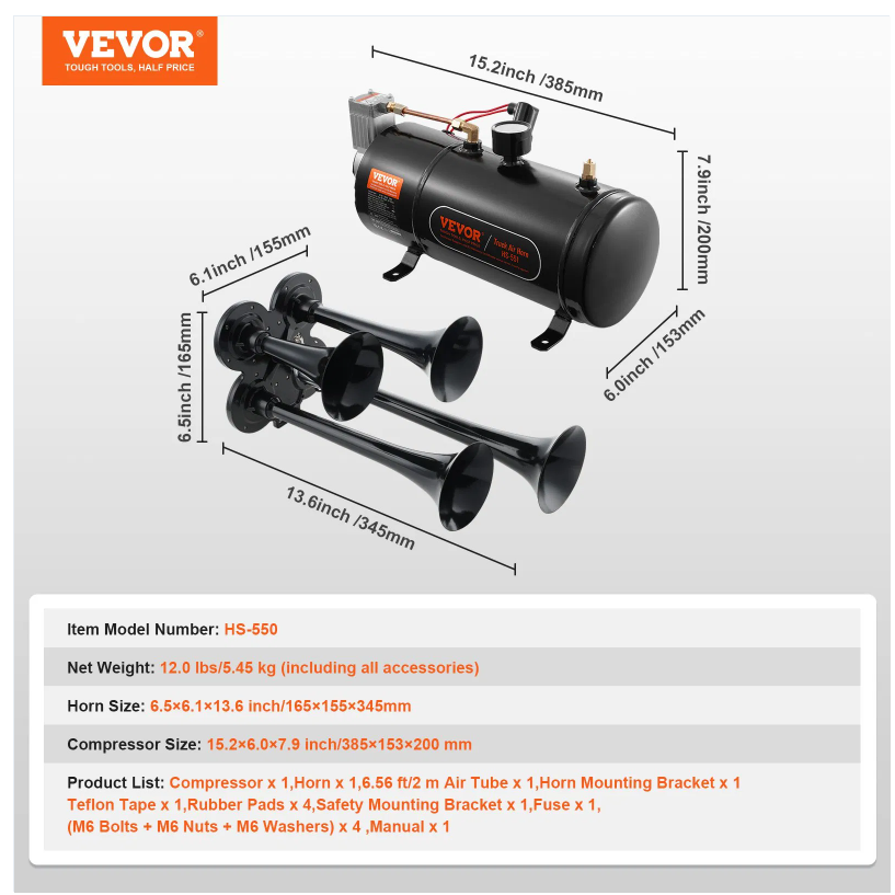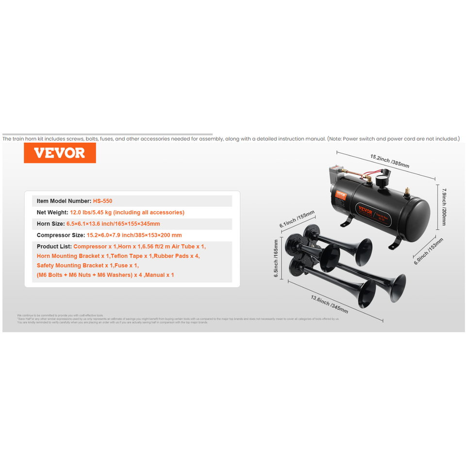 Kit Clacson Treno VEVOR, Kit Clacson ad Aria a 4 Trombe, Clacson Treno 150dB per Pickup, Compressore d'Aria 12V 120 psi