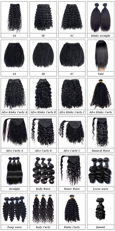Yaki, Onda profonda, Kinky Curl, Arricciatura del Jerry, Onda italiana, Onda di Afro, Dritto, Kinky Straight, ALLENTATO ONDA PROFONDA, Onda Naturale, Onde sciolte, Onda del corpo, onda di acqua, Onda diritta serica, Ricciolo di lussoStile
