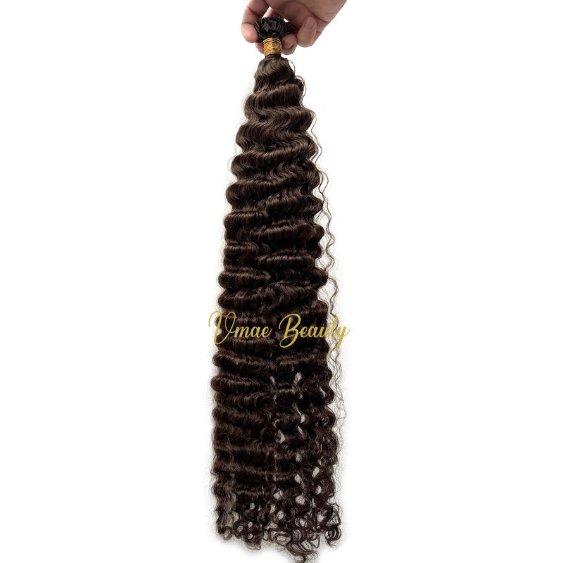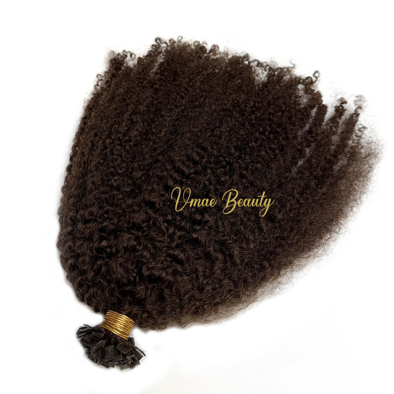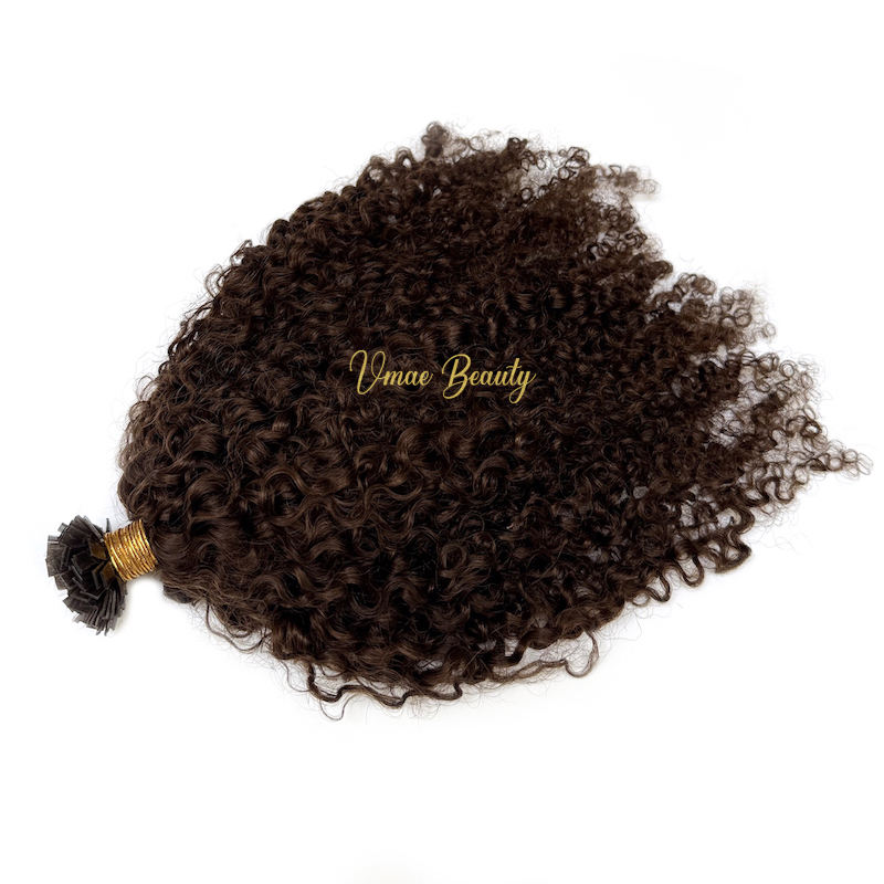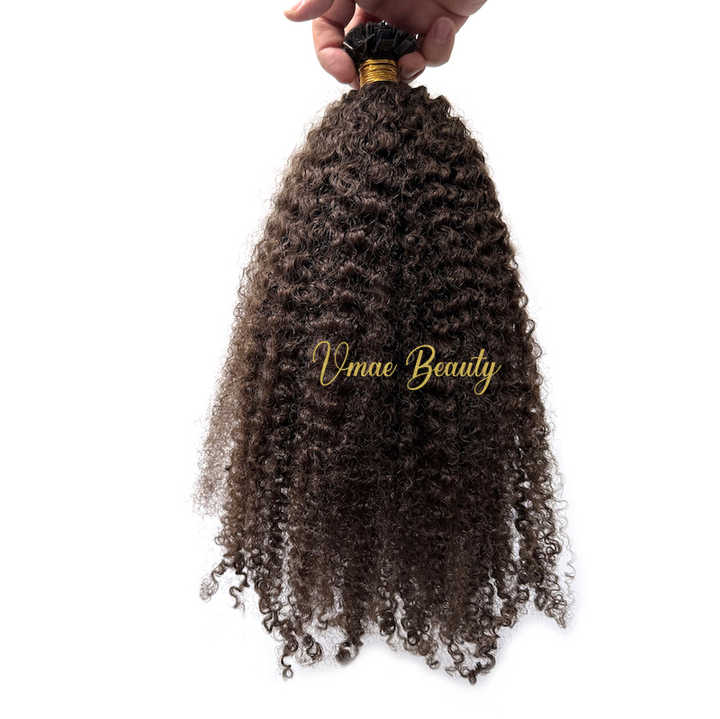 Estensione di capelli umani vergini non trattati VMAE Raw Burmese, colore castano scuro, spessore e lunghezza massime, ricci afro crespi, con punta piatta a K, tipo I-Tip