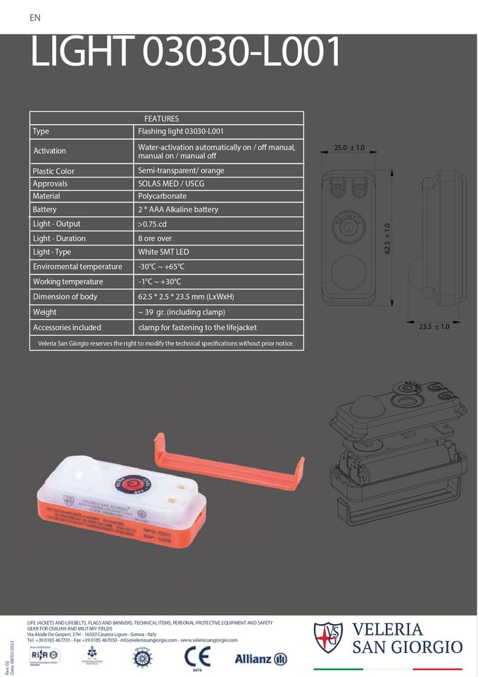 VSG L001 SOLAS M.E.D. Luce Manuale/Automatica Approvata per Giubbotto di Salvataggio con Clip per Batteria Alcalina per Salvataggio