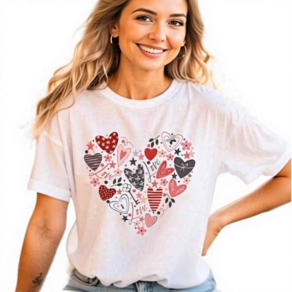 T-shirt da donna in puro cotone a maniche corte girocollo, casual, vestibilità ampia, primavera estate, con stampa a trasferimento termico a cuore di San Valentino