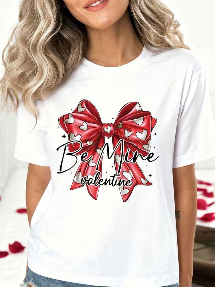 Valentine's Day Bow Heart Printed T-Shirt Women Short Sleeve Round Neck Casual Top Sweet Fashion Spring Summer 100% Cotton