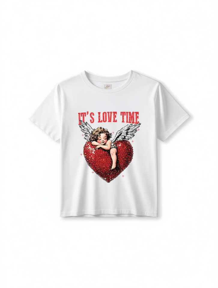 Valentine's Day Cupid Printed T-Shirt Women Short Sleeve Round Neck Casual Top 100% Cotton Jersey Sequined Design