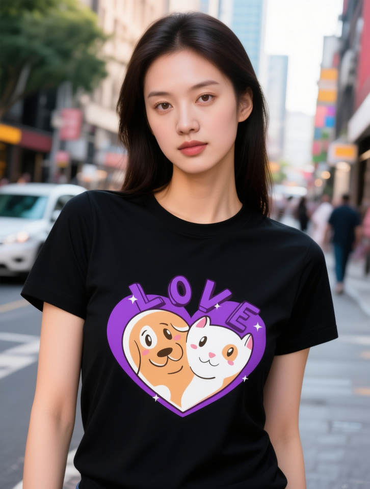 Valentine's Day Dog Cat Heart T-Shirt Purple Love Cartoon Print 100% Cotton Crew Neck Regular Fit Black S-XXXL Spring Summer