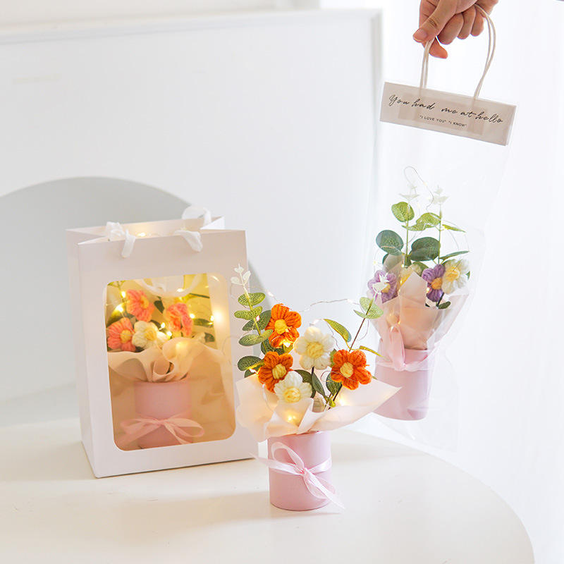 Valentine's Day Gift Artificial Hand Woven Knitted Flower Mini Sunflower Crochet Bouquet with LED Light Wedding for Thanksgiving