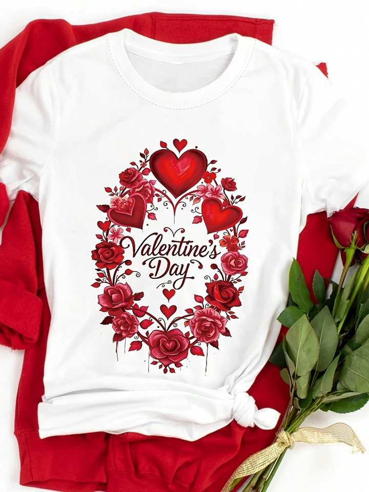 Valentine's Day Heart Flower Print T-Shirt Women Short Sleeve Round Neck Casual Top 100% Cotton Jersey Spring Summer