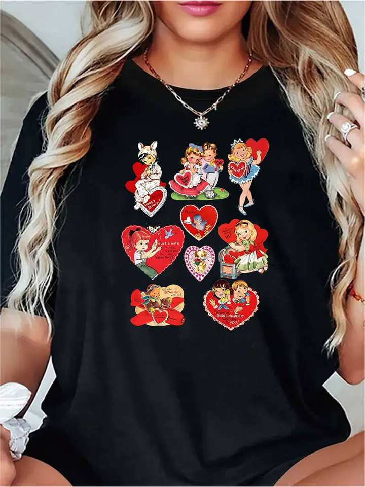T-shirt con stampa a cuore per San Valentino, da donna, a maniche corte, girocollo, casual, per le vacanze, in morbido tessuto jersey traspirante