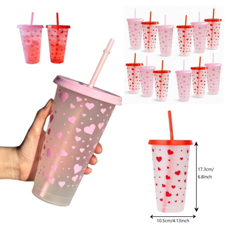 Valentine's Day Love Heart Plastic Cups with Lids Straws 24oz Reusable Tumbler for Birthday Wedding Bridal Shower Party Supplies