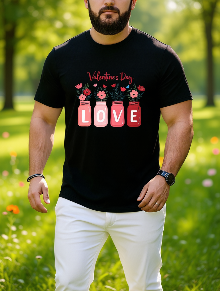 Valentine's Day Love Mason Jar Print T-Shirt Large Size Short Sleeve Round Neck Unisex Casual Wear 100% Cotton 180g Jersey