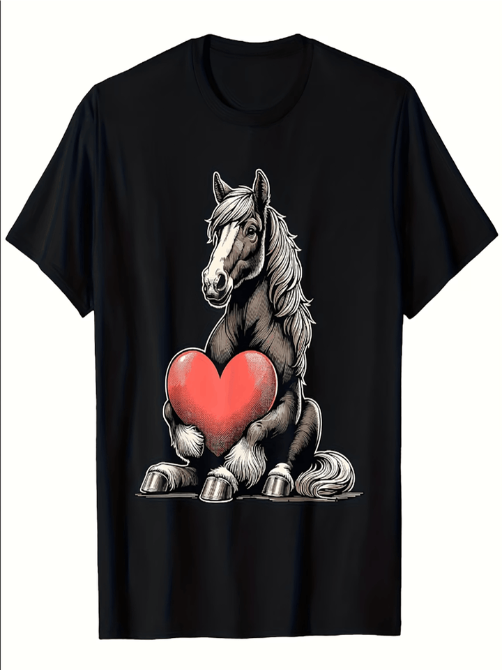 Valentine's Day Men's T-Shirt Cute Horse Red Heart Graphic Black Loose Fit Casual Short Sleeve O-Neck Digital Print Jersey
