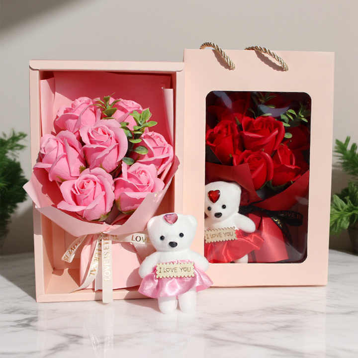Bouquet di Fiori di Sapone a Forma di Orsetto Fatto a Mano per San Valentino e Festa della Mamma con 7 Rose, Confezione Regalo Creativa per Insegnanti