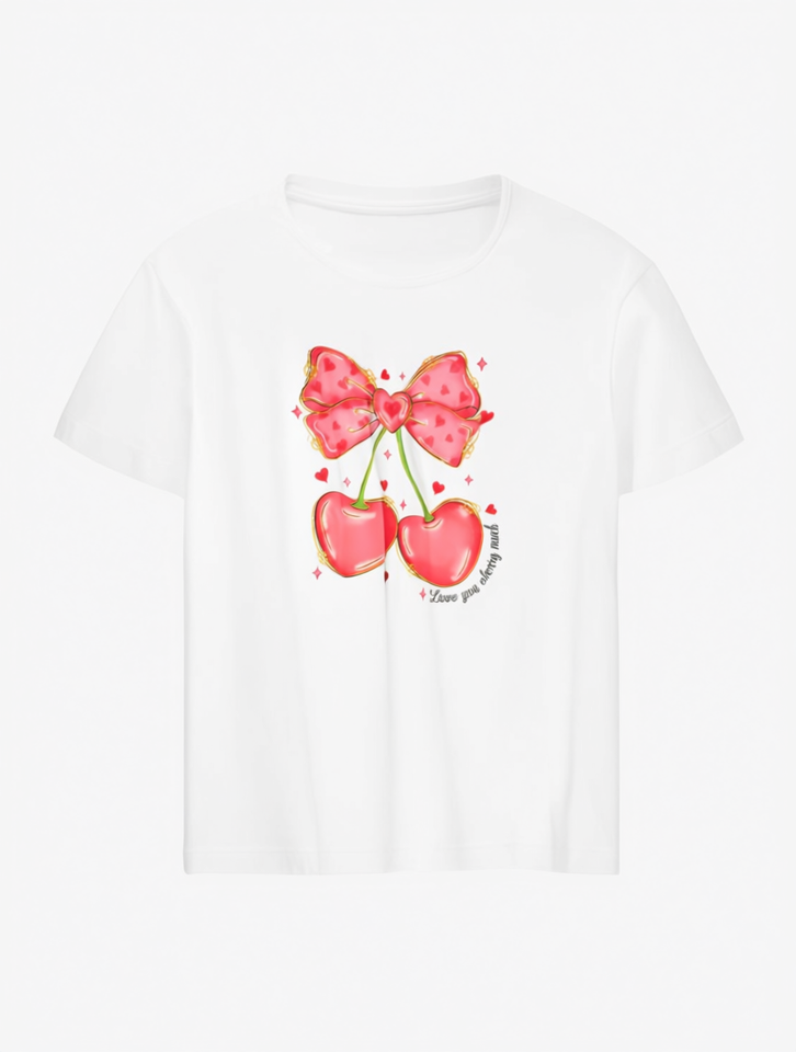Valentine's Day Printed Short Sleeve T-Shirt For Women Cute Bow Design Crew Neck 100% Cotton Jersey Spring Summer Regular Fit