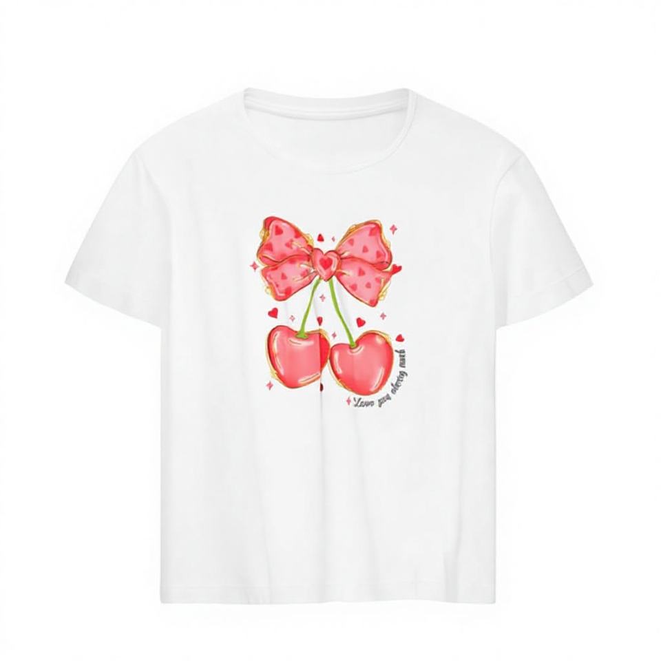 Valentine's Day Printed Short Sleeve T-Shirt Women Cute Bow Design Crew Neck 100% Cotton Jersey 180g Spring Summer Regular Fit
