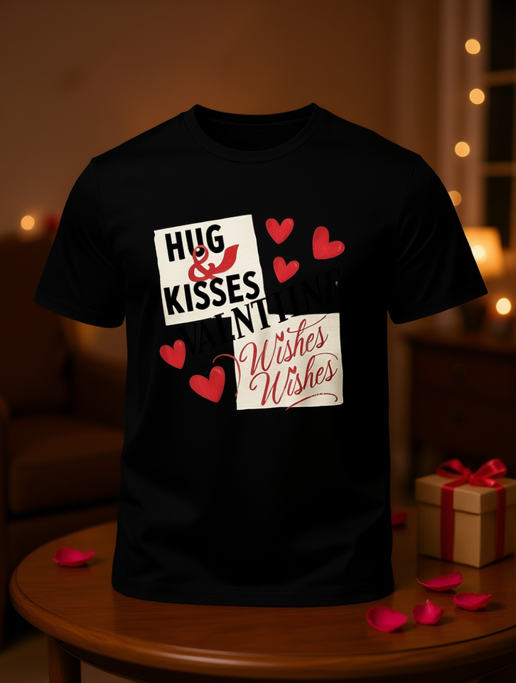 Valentine's Day T-Shirt Men Large 100% Cotton Soft Breathable Hug Kiss Heart Design Casual O-Neck Short Sleeve Printed Jersey