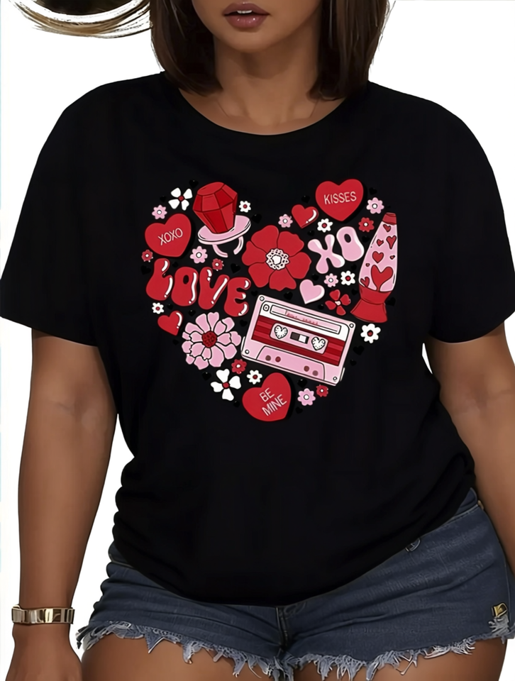 Valentine's Day Women's 80s Retro T-Shirt Black Short Sleeve Round Neck Red Heart XOXO Print Soft Cotton Casual Tee