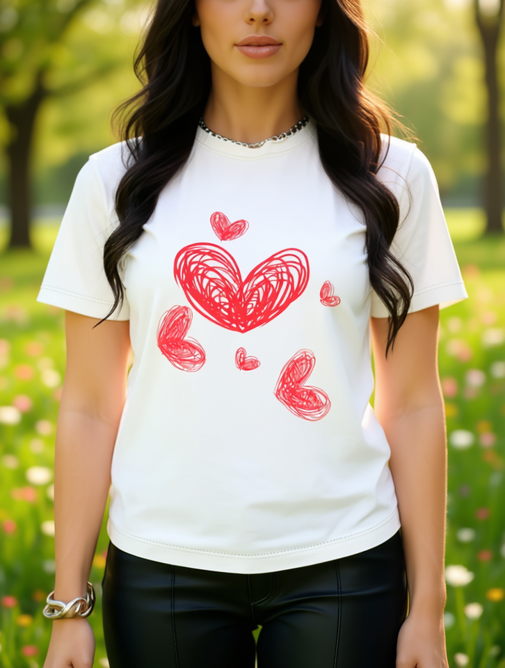 Valentine's Day Women's Casual T-Shirt Short Sleeve Round Neck Line Heart Print Breathable Lightweight Cotton Top Spring Summer