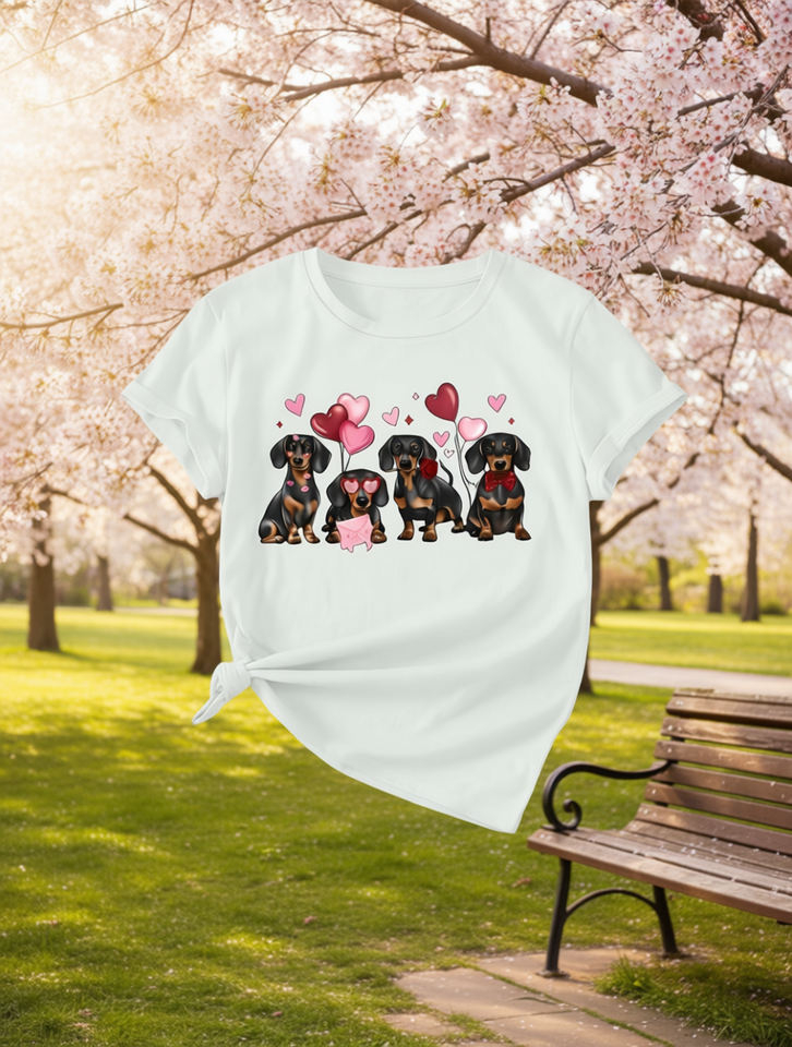Valentine's Day Women's Dachshund Print Short Sleeve T-Shirt Round Neck Casual Spring Summer Fashion Top 100% Cotton Jersey