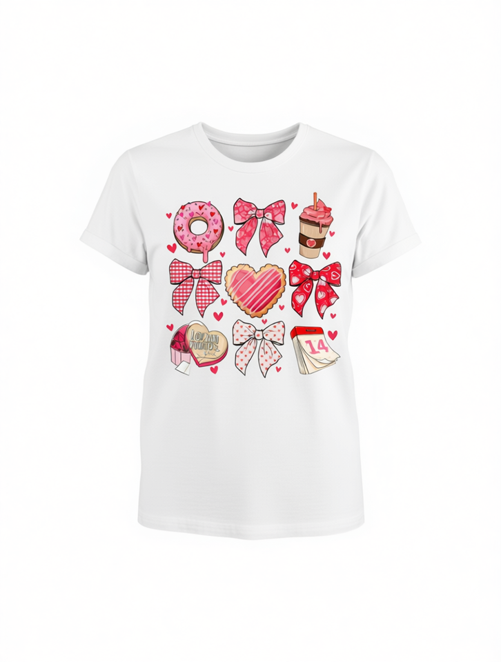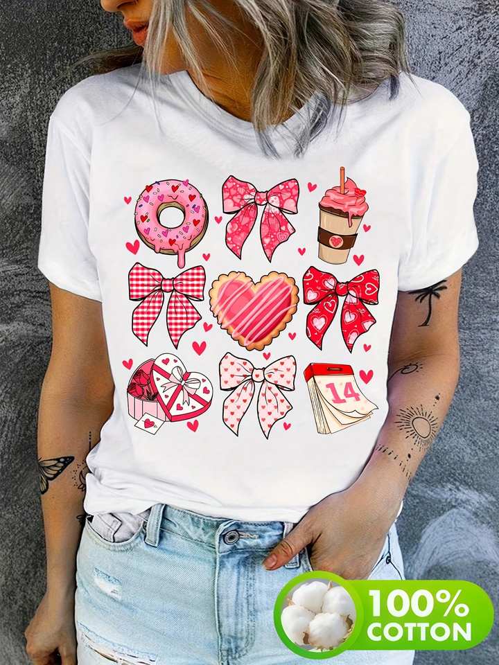 Valentine's Day Women's Plus Size T-Shirt Bow Donut Coffee Print Casual Round Neck Short Sleeve Knit Fabric Gift Top
