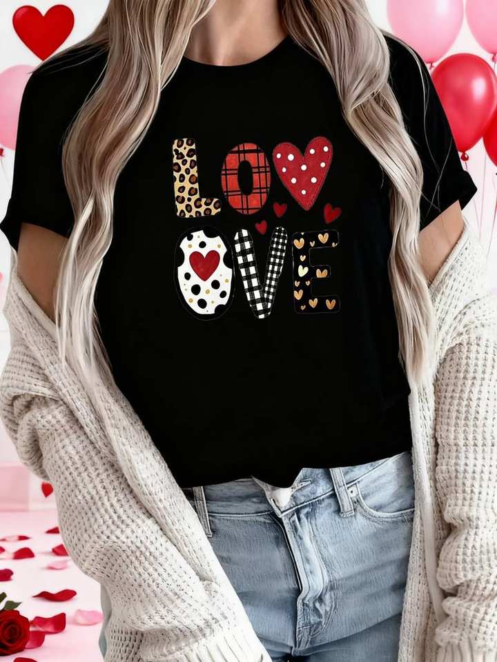 Valentine's Day Women's Plus Size Love Print Short Sleeve T-Shirt Polka Dot Striped Casual Round Neck Jersey Cotton